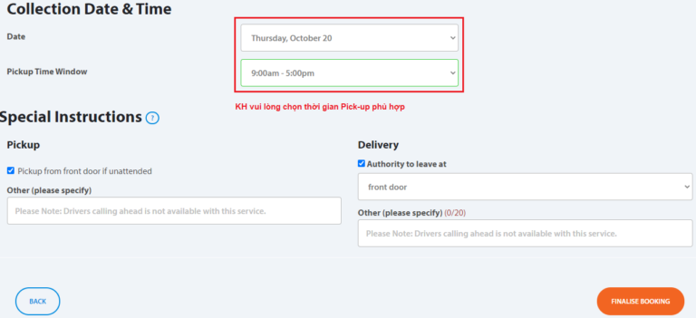 - Nhân viên pick-up sẽ đến lấy hàng trong khung giờ đã chọn mà không báo trước hoặc liên hệ trước khi đến lấy.