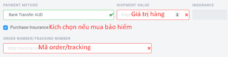 Chọn hình thức thanh toán, điền giá trị hàng, mã order/tracking, bảo hiểm (nếu có)